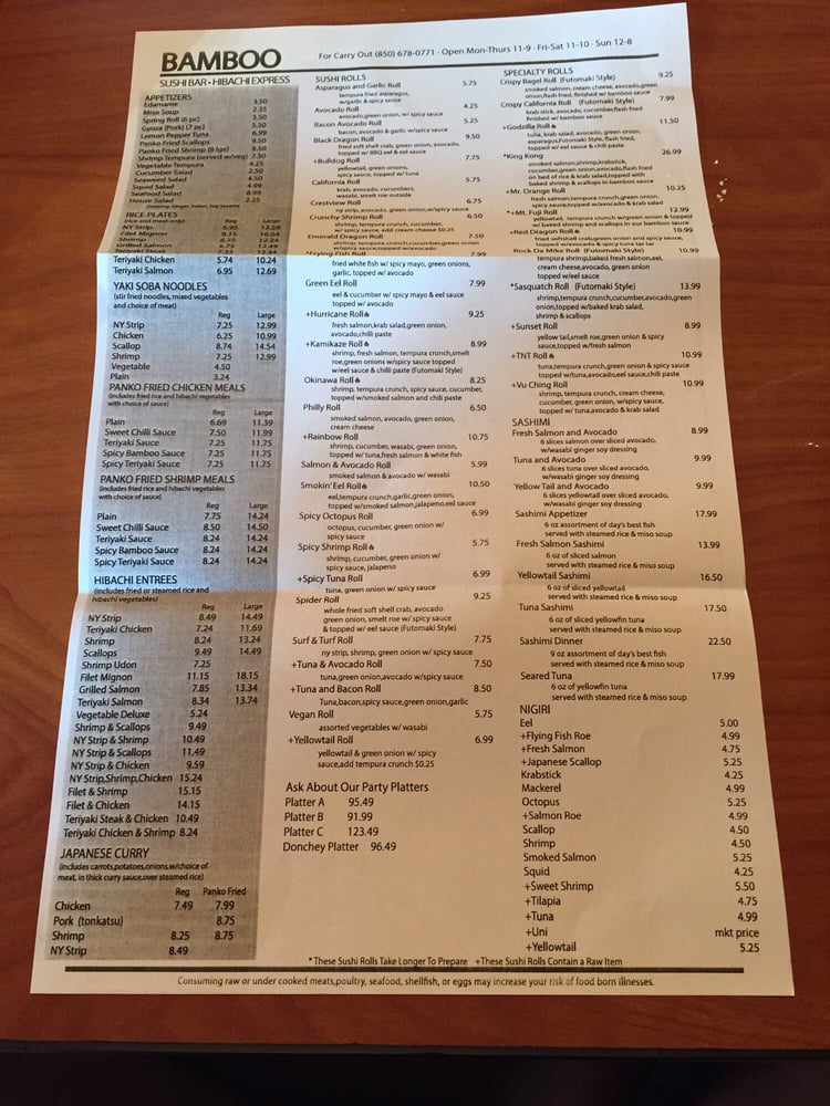 Bamboo Sushi Bar & Hibachi - Niceville Menu